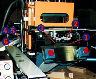 the fixture and positions them in the mold (3). The mold closes and is injected